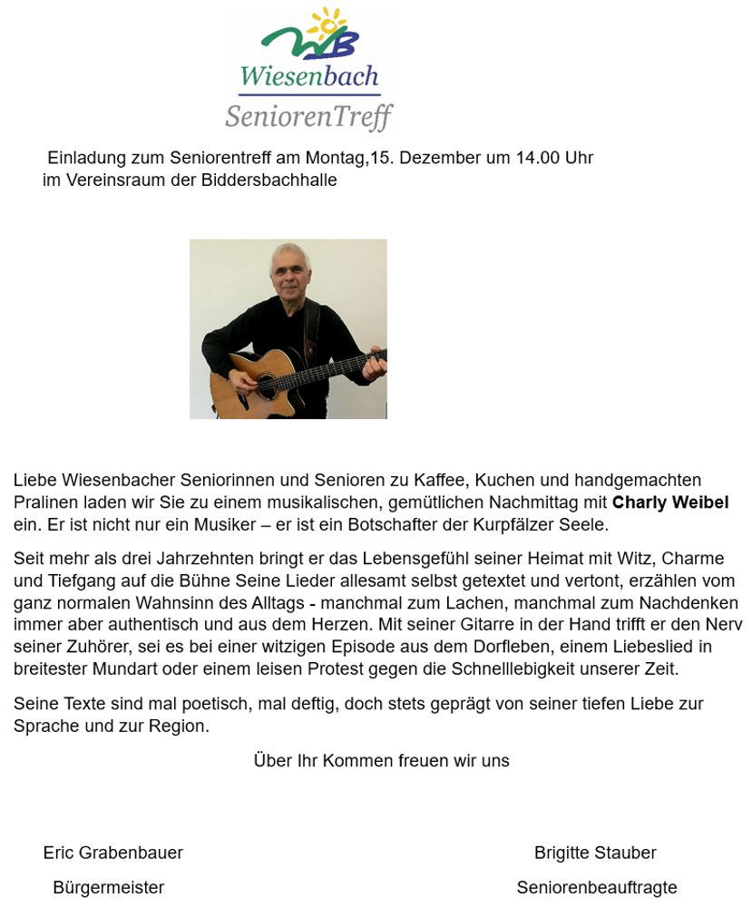 Ankündigung zum Seniorentreff am 15.12.25 in Wiesenbach In den Wiesenbacher Nachrichten wurde meine dortige Veranstaltung angekündigt: Weitere Artikel ansehen Vorheriger BeitragRückblick auf die Oftersheimer Zeitreis Das könnte dir auch gefallen Neue CD 9. Oktober 2020 Stärkung der Dialekte durch das Land angemahnt 19. April 2021 Weißwurst-Frühstück am 12.10.2023 12. Oktober 2023