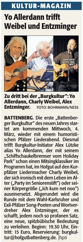Ankündigung in der Rheinpfalz für den Auftritt in Battenberg In der „Rheinpfalz“ wurde im Kulturteil der gemeinsame Auftritt mit Yo Allerdann und Alex Entzminger auf der Burg Battenberg angekündigtBattenberg 2026 Weitere Artikel ansehen Vorheriger BeitragJahresempfang der SPD Rhein-Neckar Das könnte dir auch gefallen Bericht zum Schlagerplanet 13. März 2019 Pälzer Urgesteine in Mußbach 30. März 2024 Aktiv im Alter 2023 4. Januar 2023